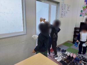 毎月行っている掃除の活動、掃除というとマイナスなイメージを持たれがちですが、ハグハグスターに通所してくれる子たちはその日の活動が掃除だと分かると「よっしゃー!」「宿題しやなあかんから間に合うかな?」と意欲的な声が聞こえてきます。今回もホワイトボード、靴箱、机、窓など自分たちで掃除する場所を考え、役割分担をして進めていきました。「ここも汚れとる!」「ここ一緒にやろ!」と声をかけあい、最後まで協力して取り組んでくれました。皆のおかげでピカピカになりました!!