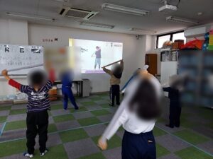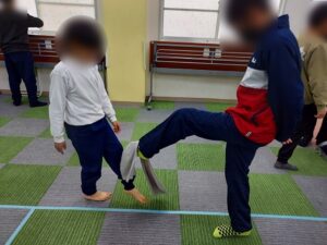 タオルバランスゲームをする前に準備体操としてタオルを使ったストレッチをしていきました。最初はタオルを太ももに乗せ、片足立ちでバランスを取っていきました。片足立ちに慣れてきたら足の甲にタオルを乗せ、友だちに渡していくゲームをしました。タオルがふにゃふにゃとしているため思うように渡せず苦戦していました。「あ~無理!」と言いながらも諦めず頑張って取り組んでくれていましたよ!次にタオルの上に二人で立ち、数秒間バランスを取るゲームをしました。徐々にタオルが小さくなっていくため「こうやったらいいんちゃう!」と乗り方を相談し協力しながら取り組んでくれていました。最後に背中を向けて立ち、合図で足の間に置いたタオルを取り合うゲームをしました。その場から動かないというルールでしたが、タオルを取る勢いでバランスを崩してしまうことが多く、苦戦していました。今回バランスを取りながらというゲームが多く難しそうでしたが最後まで楽しんで参加してくれていました。