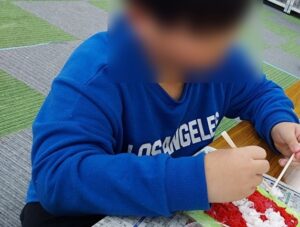 ティッシュアートに挑戦してみました!子どもたちからは「ティッシュ使うのもったいなくない?」「え、こんなに使っていい?」と心配する声も聞こえてきましたが、今回は贅沢にティッシュを使って作品を作っていきました。最初に複数枚のティッシュを水で濡らし、しっかりと絞っていきました。次にそれらをカップの中に細かくちぎり、ボンドと絵の具を入れ混ぜていきました。最後に下絵が描いてある台紙に置いていきました。台紙に置いていくのが難しく、「なかなか置けやん・・・」「(手に)ついてくる・・・」と苦戦している子が多かったですが、最後まで諦めずに取り組んでくれていました。できあがると嬉しそうにしばらく眺めていましたよ!!