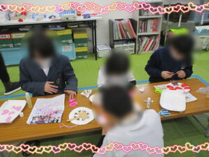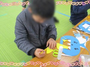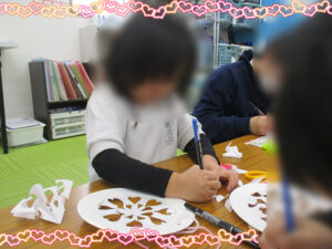 2月は、なかなか壁面が鮮やかにならない月で、少しでも可愛く室内を飾りたいと思うので、めちゃくちゃキュートな飾りを作っていきました!!!この日は、時間が少ないので、始まりの会で短時間で宿題を終わらせて欲しいことを伝え、みんな続々と工作に参加してくれました。今日は、紙皿を枠に使い、プリンター用紙や折り紙を使い、切り絵をしていきました。切り絵を紙皿の枠に貼り付けてから、クマやハートを飾っていきます。インフィニティでは、工作の時にいかに可愛く、綺麗に作るのかもみんなに考えてもらいながら進めています。低学年の子は、見本を見ながら進めてくれました。時間のない中、子どもたちは、自由時間を延長してもなお、作ってくれる優しい子たちです!!完成すると、みんなで見比べていました。その日には飾れなかったので、次の日の午前中に飾っておいたら、自分の作品がどこにあるか探していました。