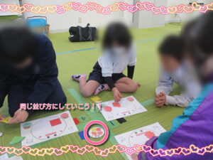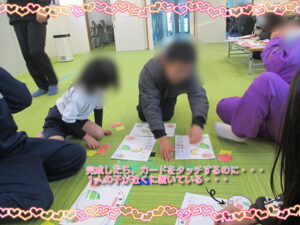 今日は節分・・・!!インフィニティは、6限下校の子が多く、途中参加からでも楽しめるよう、指導員が3つのゲームを考えてくれました。1つ目は、恵方巻ゲームです。いろんな具材を使い、お題の恵方巻と同じよう具材を配置していくゲームです。完成したら、お題のカードにタッチして終わりです。みんなの様子を見ていたら、大人も参加したくなり、いいなーと眺めていました。みんな次は、他の子より先に完成させたいとどんどん集中していくのですが、楽しかったようで、笑い声が聞こえてきました!2つ目は、モンタージュ遊びです。2人1組で行うゲームですが、あらかじめ顔のパーツが番号で決められており、言われた番号の輪郭から目、鼻、口、頭などを描いていくゲームです。どんな鬼になるのか分からないのですが、描く担当の子は一生懸命描いてくれていて、完成したものをもう1人の子に見せると大笑いして・・・みんな楽しく絵を描いてくれていました。最後は、鬼VS豆ゲームです。鬼は、指導員と高校生の子、豆は子どもたちです。ボッチャの枠の線を歩いていき、お互いぶつかったらジャンケンして勝てば進み、負けたら交代していくゲームです。最初は、和気あいあいでしたが、お互い負けたくない気持ちが強くなり、応援合戦!白熱した戦いを繰り広げていました。長い闘いになったので、終わるとみんな疲れていました。肝心の豆まきは、せず・・・みんなで美味しく豆を食べて終わりました。