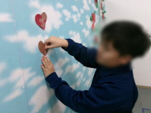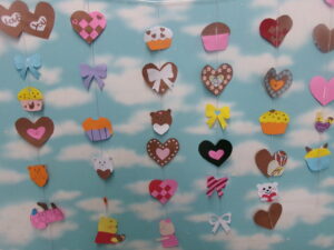 できた壁面を飾っていきます。「かわいい~!」「このチョコ誰が作ったん?」とお友達の作品にも興味を持つ姿もありました。「○○さん、バレンタインの活動平成女児のチョコ作ろうよ!」と来週にはバレンタインの調理実習を控えていることもあり、今回の活動を通して更に楽しみになった様子の子ども達でした🌟