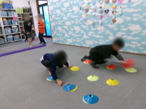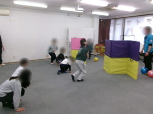 次はマットとマットの間を一瞬通るボールの色を見極めて動く内容でした。これも動体視力と色の認識が必要になってきますね。青は一歩進む、黄色はしゃがむ、赤は止まるのように信号機の色と一致するような動きに決め、取り組みました。始めは横の子の動きに合わせてしまいがちでしたが、何度か繰り変えてしていくうちに自分で色を見極め、動くことが出来ました。