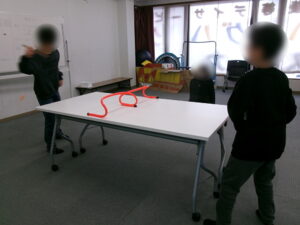 次のステップとして机上で球を転がしながらラリーを行いました。前日の活動で行ったビジョントレーニングを思い出しながら、転がってくる球をよく見て打ち返しました。1分間で何回できるかな?とペアの子と挑戦します。1回目よりも2回目の方が10~30回記録を伸ばすことができ、大喜びでした🌟