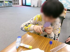 型を使って形を作っていくのもこの1年でとてもスムーズになりました。ハサミの使い方も上手になり、線の上をとても綺麗に切れるようになりましたね。今回の制作ではチョコレート(茶色の画用紙)に自分でアレンジを加えてもいいとのことで、子ども達も「どんなのにしようかな~」と想像を膨らませながら、自分だけのチョコを作っていく姿がありました♪型抜きを使ってアレンジをする子、得意の切り紙を使って文字を作る子、画用紙で編み込みをする子など、自分だけのチョコのデザインに気分はパティシエです🌟