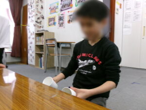 第1段階としてビー玉キャッチと新聞棒キャッチを行いました。ビー玉キャッチは机の上を転がってくるビー玉を紙コップで受け止める、新聞棒キャッチは2色のテープが貼ってある新聞棒を投げ、指定されたテープの位置でキャッチする内容です。