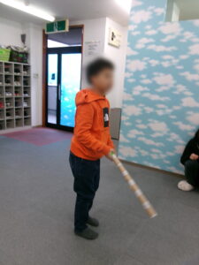 ビー玉キャッチは得意な子も多く、全部の球をキャッチできる子も多かったです。新聞棒キャッチは手首の使い方や力加減も必要になってくるので難しさを感じる子も中にはいましたが、アドバイスを聞きながら諦めることなく取り組むことが出来ました。