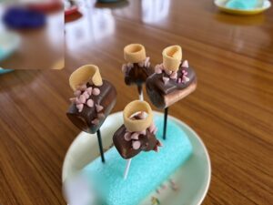 チョコを湯煎しトロトロに溶けていく様子に、子どもたちもとろけそうな表情に・・・☺とっても可愛かったです☺溶けたチョコレートを絞り袋に入れ「ポテコ」の穴に入れていきます。パティシエ並みの手際よさの子もいてビックリ😲聞いたら「お家でしたことあるから」とのことでした。またマシュマロを一人ひとりチョココーテイング・デコレーションをし楽しみました♬