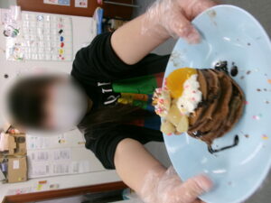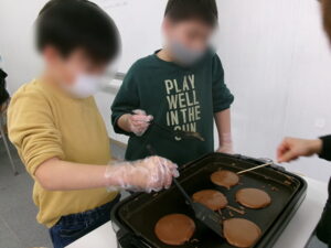 みんな大好きなお菓子作りの活動です。この日はバレンタインデー。「何作るん??」とワクワクした表情でスカイに来てくれました。今回は皆で甘いパンケーキを作りました。