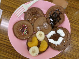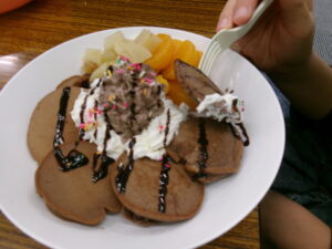 できあがった生地をホットプレートで焼いていきました。まん丸のパンケーキになるように、お玉でそっと生地を垂らしていきます。ひっくり返すときに苦戦している子がいると、すっと手伝ってあげたり、「こうやったらやりやすいよ」と教えてあげる姿も見られました。協力する姿や優しい声掛けに、子ども達の成長を感じる場面でした。いい香りがしてきて、美味しそうなパンケーキがたくさん焼きあがりました。最後にホイップクリームやフルーツ、シュガーパウダー、チョコレートソースなどを思い思いにトッピングすれば、個性あふれるかわいいパンケーキプレートの完成です!