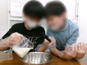 まずは生地作りです。卵を割り牛乳を量って入れ、よく混ぜます。「家で卵焼き作ったことある!」と慣れた手つきで卵を割ってくれる子もいれば、おそるおそる卵にこつんとヒビを入れ、そっと割ってくれた子もいました。皆上手に割れましたよ😊ホットケーキミックスとココアパウダーを混ぜれば、チョコ風味の生地の完成です。