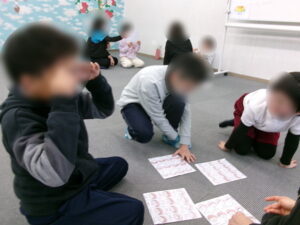 まずは、表情を見て感情を当てるゲームです。「うれしい」「かなしい」「こわい」「こまる」「おこる」などの気持ちとイラストの描いてあるカードを引き、声を出さずに表情だけで気持ちを表現します。見る側の子ども達は、その表情をよく観察し、どんな気持ちなのかを想像して答えていきました。いつもより少し大げさに表情を作り、相手に伝えようとする姿がとても印象的でした。「うれしいと楽しいは似てるよね」「わからないと困るも近いと思う」など、相手の表情をよく見て考えている様子でした。中には「え、この気持ちでそんな顔するん?(笑)」と、お互いの感じ方の違いに気づく場面もありました。それも大切な気づきだと思います。感情の表現は人それぞれ違うこと、だからこそ相手の気持ちを想像する思いやりを持つことが大切だということを、ゲームを通して学ぶことができていれば嬉しいです。
