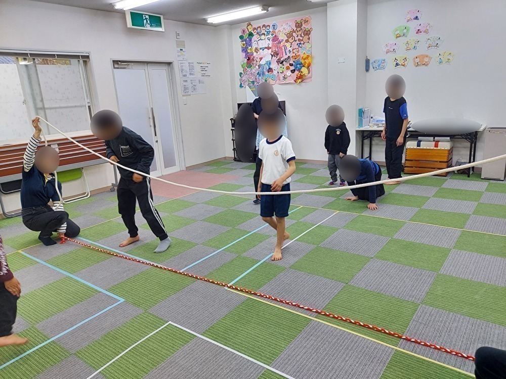 いろいろなゲームのルールを聞き楽しみました。はじめに十字鬼をしました。鬼は十字の線しか動くことができず、子にタッチをしていきます。子はコート内を鬼にタッチをされないように3週したら勝ちのルールにしました。子どもたちは線を意識することが難しく、何度か線の外に出ることが多くありました。何度かしていると線を守ることができ、「こっちにきたらダメだよ!」と子は集まらないようにして協力する様子が見られましたよ。次にムカデドッジボールをしました。鬼は四方からボールで当てていき、子は4人で縦一列になり、1番後ろの子が当てられたら負けのルールにしました。子は一番後ろの子が当てられないように、先頭の子はボールからガードをしながら動くため、何度か列が分裂することがありました。鬼はたくさんパスをしながら協力をして当てていました。次にいろはにほへととうゲームをしました。鬼は2人でロープをもちながら上下に動かしていき、子どもたちはロープを見ずに上、下、真ん中を決めていきました。ルートを決めたら体がロープが当たらないように決めたルートを通っていきます。ルートによっては「かんたんや!」とすぐに進む子や「どうやって通ろうかな・・」とロープの前で考える子もいました。ロープに当たらずに進むことができると嬉しそうな表情で大変盛り上がりました。