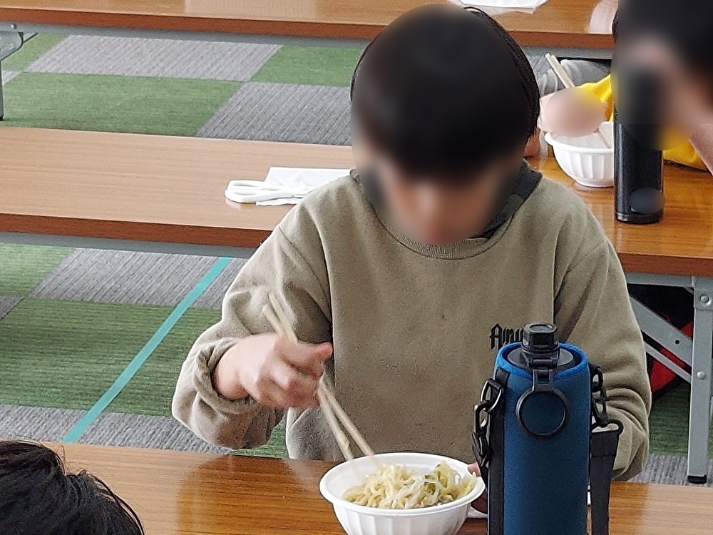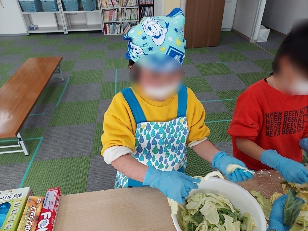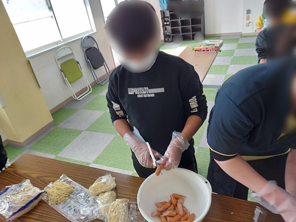 子どもたちの大好きな調理実習をしました。はじめに腕まくりやマスクをして、きれいに手を洗っていきました。手袋をはめる時に苦手な子は「てつだって・・」と苦戦をしながらもつけていきました。キャベツをちぎる子、スープを準備する、麺を茹でるなど役割分担をしながら行いました。キャベツは1玉とたくさんあるため、「つかれた・・」と根気よくちぎっていました。冷凍の肉団子は電子レンジで1分半温めていき、スガキヤのスープの入った鍋に慎重にもやしなど入れていきました。麺はお湯に入れてタイマーを見ながら茹でていきました。できあがると「おなかへったー」、「いいにおいがする」と待ちきれない様子でした。みんなで手を合わせて「いただきます!」をしました。「おいしい!」、「おかわり!」と大満足な子どもたちでした。