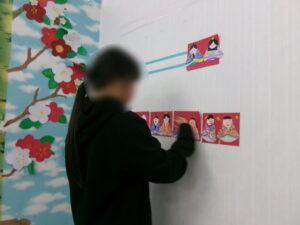 完成した個性豊かなお内裏様とお雛様は、最後は自分たちの手で壁に飾り付けました。1人の子が全体のバランスを常にチェックし、「この辺に貼った方がええな」「あぁこれは上の方やな」と、考えながら貼り付けてくれていました。