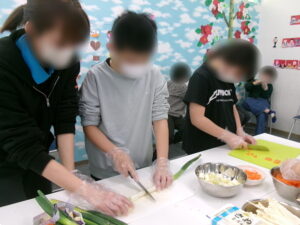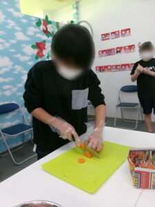 まずは1番の大仕事「具材切り」からスタート。前日に「切り方知ってるで」と自信満々だった子ども達は調理の際には「猫の手」を意識し、慎重に丁寧に具材を切り進めていきました。