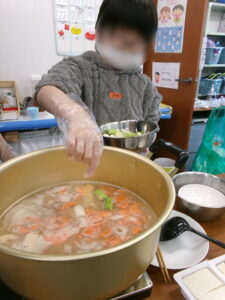 切った具材を鍋に入れる際には、スープが跳ねないように慎重に入れていきました。鍋を温めていくうちに段々といい匂いがし始め、「ええ匂いするやん~はよ食べよ~」と、頂きますが待ち遠しい様子でした。