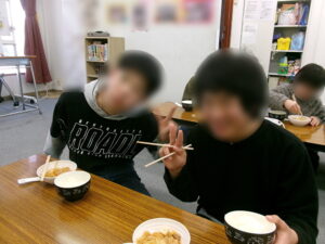 そして待ちに待った、いただきますの時です。今回作った鍋の素には辛みを追加する調味料がついており、自由に調整が出来たので、子ども達の好みによって選べるようにしました。「オレ、辛いのイケるから」と1杯目から辛めに挑戦する子もいれば「辛いの苦手だから」とそのままの味を楽しむ子、おかわりの際に「辛くしてみようかな」と挑戦する子など、自分の好きな味を探求する様子がありました。「そのままもうまいけど、辛いのもアリやな!」「天下一品の方がうまいと思ってたけど、赤からもうまかったな」と、自分好みの味を見つけていました。