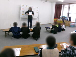 まずはお鍋のスープの素やお鍋の定番具材の紹介からしました。鍋のスープの素を一覧にして子ども達に紹介したところ、「天下一品!?」と、ラーメン屋さんのスープをベースにしたものが気になった子が多かったです。具材の紹介では、「あれ白菜なんや~」「鶏肉って入れるん?」と、それぞれの素直な感想を口にしながら指導員の話に耳を傾けていました。また「キノコは絶対嫌や!」と、自分が苦手な食材を全力でアピールする子もおり、子ども達の好き嫌いが表に出た瞬間でした。
