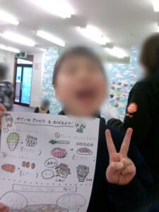 活動の最後には、自分の「理想の鍋」をイラストに描いてもらい、どんな具材を入れたかも書き出してもらいました。「バランスよく入ってた方がうまそうやろ」と、お肉もお野菜も満遍なく入れたり、文字通り十人十色なお鍋がたくさん描かれました。中には好きな具材をこれでもかと詰め込んだオリジナル鍋を作り出す子も(笑)同じお鍋というテーマでも、何を重視するかは人それぞれ。正解がないからこそお互いの好き嫌いが知れる楽しい時間となりました。今日出た意見を元に取り組む明日の調理実習が楽しみですね。