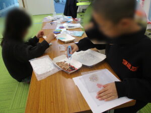 始める前に準備もかねてたくさん色のあるビーズを“暖色”と“寒色”に分けて並べました。始まりの会で“暖色”と“寒色”について説明をしていたこともあり、分け始めるとみんなで相談をしながらスムーズに分けていくことができました。