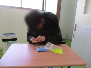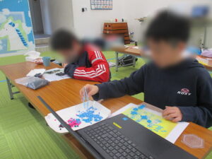 好きなものを作る前に、色や並べ方のバランスを考えて〇や□や♡のシンプルな形のものを作りました。完成してから好きなものを作り始めました。高学年、中学生、高校生は何回かやったことがあるので自分たちで形を作ってビーズを並べていくことができました。低学年の子は初めてやる子もいて、どうしよう🥺と困っていましたが、指導員と一緒に確認しながらビーズを並べていきました。少しずつ形になってくると「あと少しで完成だね🤩」と完成を楽しみにしながら進めていきました。