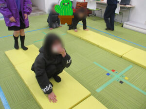 映像を見ながら太ももを伸ばすストレッチ、前屈や開脚など全身のストレッチを行いました。体を動かす準備ができてからマット運動を行いました。学校の体育の授業でやっていることもあり前転や後転や開脚前転などできる子もいました。「学校だと中々挑戦できないからやってみようかな🙄」と挑戦してくれる子もいました。