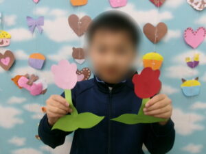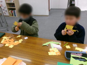 2日目は画用紙で菜の花・チューリップ・つくしの3種類を作っていきました。型紙を使って丁寧に型を取りながら作っていきます。型取りもハサミもこの1年でとても上手になりましたね。菜の花は1つ1つの花が小さく、色合いや貼り方を工夫する子も多かったです。和気あいあいとした雰囲気で楽しく作っていく姿がありました。