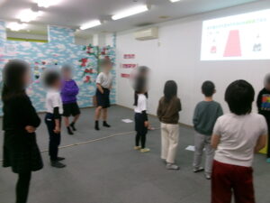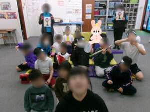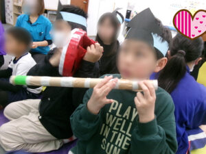 最後は初めてのゲーム、雛人形ごっこです✨名前だけ伝えると「またまた~俺らを何歳やと思っとるの!」と子ども達も大笑い(笑)内容としてはお内裏様・お雛様・三人官女・五人囃子・右大臣左大臣役の計12名分の人形役のくじと、人間役のくじがあり、人間役を引いた子が人形役の子をひな壇に見立てたマットに動かして、ひな壇を完成させようというものでした。「面白そう!」「俺は歌うのが好きやから五人囃子の扇役出すわ!」と大盛り上がり。子ども達も終始ノリノリで人形になりきってくれました。人間役の子も話し合いながら正しく並べることができ、最後はみんなでハイ!チーズ!🌟