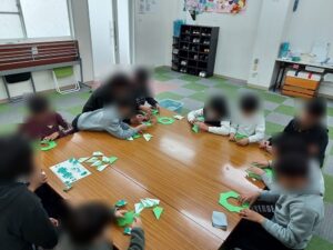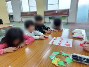 春の生き物、植物を折り紙で折り、リースを作りをしました。リースの真ん中に『に・ゅ・う・が・く・お・め・で・と・う』と入れ、新一年生を迎えよう!と折り紙が苦手な子も一生懸命取り組んでくれました。