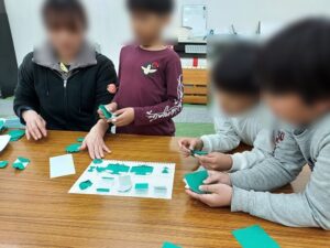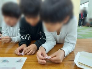 生き物はテントウムシとちょうちょです。テントウムシは二通りの折り方に挑戦しました。羽を広げているテントウムシと羽を閉じているテントウムシです。羽を広げている方は工程が多く難しかったのですが、高学年を中心にたくさん折ってくれました。一番工程の少ないちょうちょが意外と難しく、『えーーなにこれ…わからん…』とリタイヤしてしまう子が多かったです。