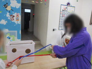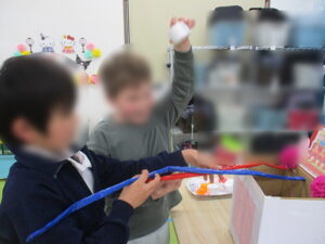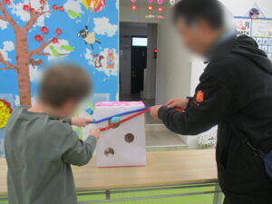 今日は、雛祭りゲームを子ども達で遊んでいました。雛あられをイメージした物を特定の穴に二人で協力して入れるゲームではペアが思ったように動けなくて「そっちじゃないよ」「こっちだって」と指示を出す子がいたり、上手に連携を取りながら遊んでいる印象でした。
