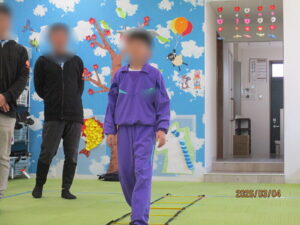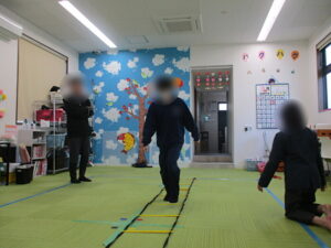 今日は、姿勢に意識を置くような活動でした。始めはつま先立ちでラダーの間を歩きましたが始めは、なかなかまっすぐ歩ける子がいない印象でした。しかしみんな笑顔で楽しそうに取り組んでいたのでその後も色々な運動が出来ました。