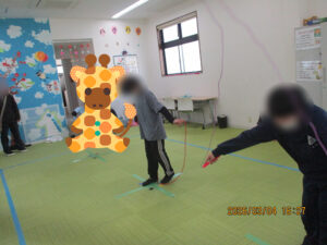 運動が苦手だからと活動に乗り気ではなかった子どももいましたが楽しそうな声にひかれて次々と参加してくれました。他には頭に本を置いて落とさないように歩きました。各々工夫して上手に歩きました。失敗しても誰も攻めません、馬鹿にする様子もなく仲良く笑っていました。その様子を見ていると施設内がとても明るいように感じました。最後は縄跳びをして前回りから交差跳びまで幅広く挑戦しました。みんなで八の字跳びをすると、「僕跳べるよ!見てて!」と指導員に声をかけている子もいました😊みんなに注目される中、成功するとうれしそうにしていました☺️✨