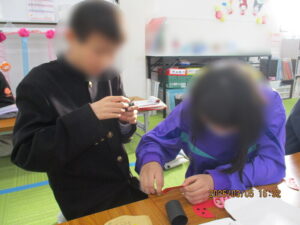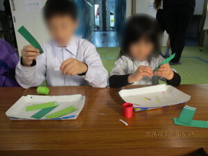 1日目は生き物🦋の制作です。ハチ、イモムシ、ちょうちょ、テントウ虫を作りました。事前に指導員が用意していたパーツを使って、輪っかを作ったり、パーツを貼ったりする作業をしました。制作をするときに、丁寧に作ること、角と角を合わせることなどを伝えてもらっていたので子どもたちは丁寧に慎重に制作を進めていました。