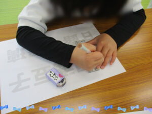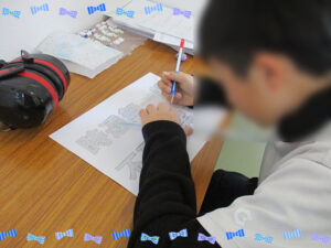 高校生の子に活動の相談をしている時に、今回は点つなぎじゃなくて、レタリングみたいなことをしたいけど、子どもたちだと、アニメのキャラクターなら、興味を持ってくれるかな!?と言うと、それならみんなするかもね!!と返事をしてくれたので、今回は鬼滅の刃のキャラクターで好きな人物を選んでもらいながら、定規を使ってふちどりをしてもらいました。早く帰ってきて、時間のある子には、以前の活動で使ったプリントでいろんな線の種類を書いてもらいました。みんなが帰ってきてから始めていったのですが、小学1・2年の子には鬼滅の刃の登場人物の漢字が難しいこともあり、文字の真ん中に線を引いてもらいました。名前で平仮名があるキャラクターの時は、フリーハンドで、縁の色に沿ってなぞってもらいました。短時間ではありましたが、みんな集中して取り組んでくれて、完成すると見せてくれました。