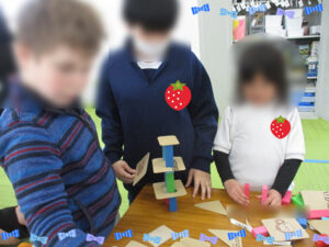 週の初めに、みんなで楽しく遊ぶ活動をしていきました。以前より何回か積み上げゲームをしていたのでいろんな道具が作ってあったので、長机を2つつけて、2つの班に分け、活動に取り組んでいきました。2つのテーブルは、違う積み上げの道具があり、15分間で机の上にある材料を使って、どれくらい高く積み上げることができるか挑戦していきました。他の子に負けたくないので、みんな考えて工夫しながら進めていました。案外、何も考えずに積み上げた子の方が上手くいっていました。途中で崩れても、悔しがりながら、また積み上げたり、周りの子が頑張っていると拍手して一緒に喜んだりして、チームワークが出て楽しそうでした。4月からまた新しい子が来てくれるので、和気あいあいとした雰囲気を続けながら、みんなで楽しく過ごせたらなと思っています。