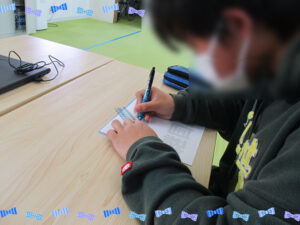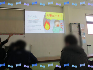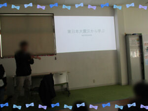 今日は東日本大震災から15年が経った日であったので、みんなで防災に関すること、地震や津波、命の大切さを学びながら、考えていきました。今日だけは、高校生も中学生もみんな学習を途中で止めて、初めから活動に参加してもらいました。いつものように和気あいあいとしていたので、真剣に考えて欲しいことを伝えるとみんな冗談も言わずに話を聞くことができました。話の最初の方で“てんでんこ”という言葉が出てきて、私たちも含めて、知らない言葉でした。東北の地方の方々の教訓から「家族が近くにいなくても、まずは生き残ることを考えること」という意味だそうです。どうしても、私たちは、周りの人のことを考えがちですが、自分が死んでは意味がないので、生き残ってから家族の安否を確認していこうという話をしてくれました。その後、反射ゲームをして、指導員の「地震だ!」「火事だ!」「避難だ!」の合図に、その場でジェスチャーをすることもしていきました。みんな真剣でしたが、一生懸命取り組んでくれていました。未だに、この地方では大きい地震が来ていないので、実感がないと思うのですが、いざ起こった時にパニックにならず落ち着いてみんなで行動できるように何回も取り組んでいきたいと思っています。