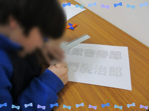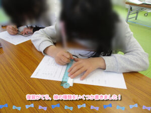 高校生の子に活動の相談をしている時に、今回は点つなぎじゃなくて、レタリングみたいなことをしたいけど、子どもたちだと、アニメのキャラクターなら、興味を持ってくれるかな!?と言うと、それならみんなするかもね!!と返事をしてくれたので、今回は鬼滅の刃のキャラクターで好きな人物を選んでもらいながら、定規を使ってふちどりをしてもらいました。早く帰ってきて、時間のある子には、以前の活動で使ったプリントでいろんな線の種類を書いてもらいました。みんなが帰ってきてから始めていったのですが、小学1・2年の子には鬼滅の刃の登場人物の漢字が難しいこともあり、文字の真ん中に線を引いてもらいました。名前で平仮名があるキャラクターの時は、フリーハンドで、縁の色に沿ってなぞってもらいました。短時間ではありましたが、みんな集中して取り組んでくれて、完成すると見せてくれました。