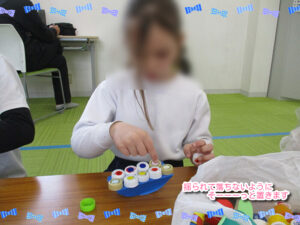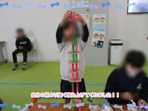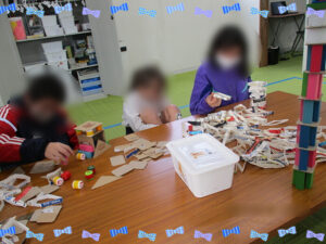 週の初めに、みんなで楽しく遊ぶ活動をしていきました。以前より何回か積み上げゲームをしていたのでいろんな道具が作ってあったので、長机を2つつけて、2つの班に分け、活動に取り組んでいきました。2つのテーブルは、違う積み上げの道具があり、15分間で机の上にある材料を使って、どれくらい高く積み上げることができるか挑戦していきました。他の子に負けたくないので、みんな考えて工夫しながら進めていました。案外、何も考えずに積み上げた子の方が上手くいっていました。途中で崩れても、悔しがりながら、また積み上げたり、周りの子が頑張っていると拍手して一緒に喜んだりして、チームワークが出て楽しそうでした。4月からまた新しい子が来てくれるので、和気あいあいとした雰囲気を続けながら、みんなで楽しく過ごせたらなと思っています。