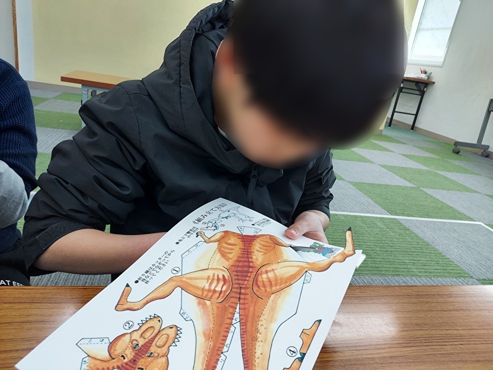 様々なペーパークラフトを作りました。まず練習でサイコロを作りました。ハサミでサイコロの展開図を切っていきました。できあがったサイコロを「はやくあそびたい」と転がして楽しんでいました。次に正十二面体にチャレンジをしました。正十二面体の展開図を切っていくのですが、でこぼこしているところが多くて、「むずかしい・・」と苦戦をしていましたが、集中して切っていきました。できあがったサイコロや正十二面体ですごろくゲームをして大きな数字がでると喜んでコマを動かしていました。最後に子どもたちの作りたいペーパークラフトを選んでいきました。恐竜に飛行機、マイクラ、銃、ポチャッコなど作りたい物もあってスムーズにハサミを動かしていました。できあがったペーパークラフトのキャラクターを使ってごっこ遊びを楽しんでしていました。