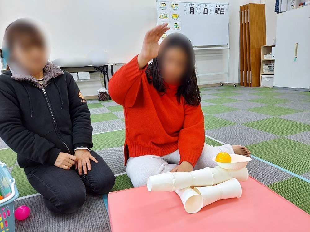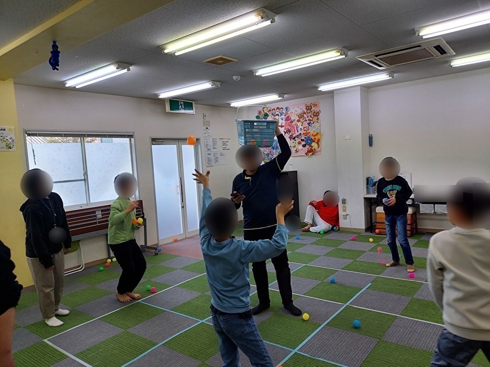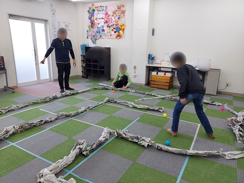 ボールを使っていろいろな遊びをしました。はじめに新聞ゲートボールをしました。新聞紙を丸めてスティックを作っていくのですが、うまく丸めることができず指導員と一緒に作りました。コースは新聞紙を細くぐちゃぐちゃに潰したものをたくさん作って並べていきました。「どこにおこうかな・・」とオリジナルのコースを作っていき、特にゴールは難しくしようと、トンネルやトラップも作っていました。順番にスティックをうまく使い力加減を考えながらボールをゴールまで運んで「やったーー」と喜んでいましたよ。次に玉入れをしました。かごの高さやボールを投げる場所、時間など、ルールを変えて、子どもたちは上手に玉を入れて大変盛り上がりました。