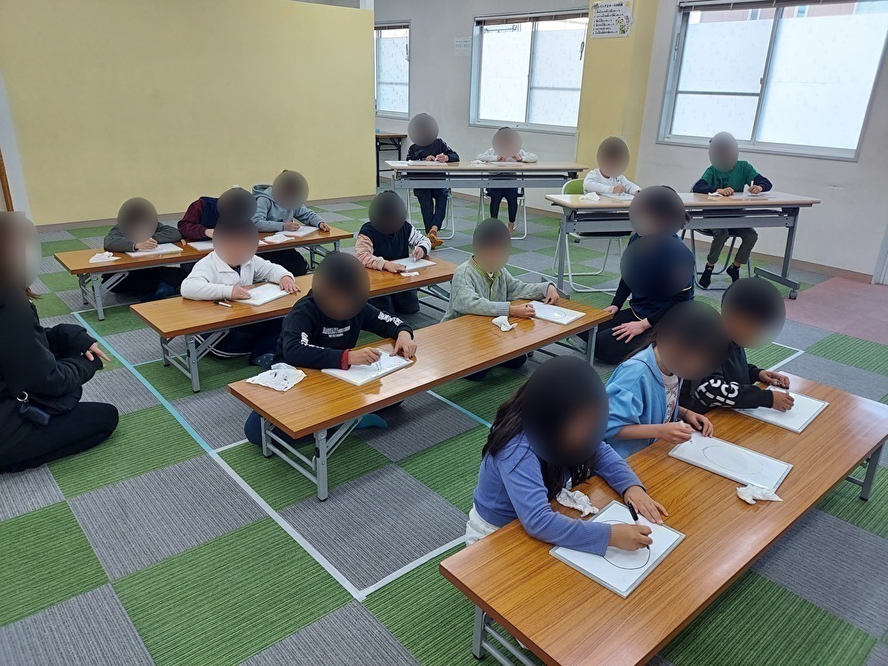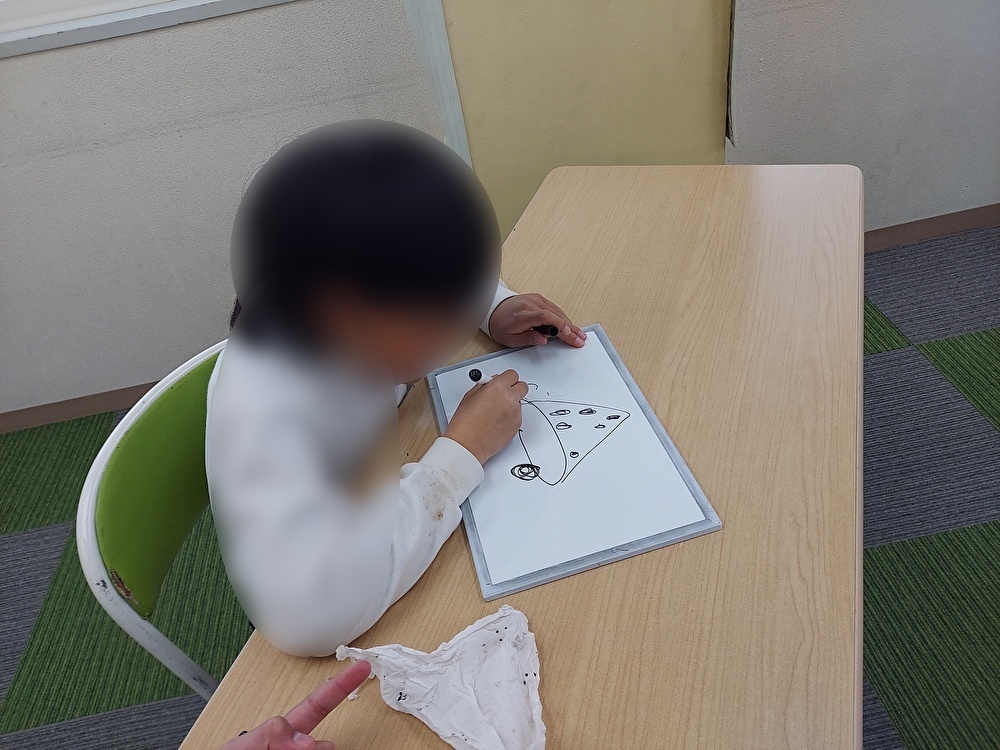 いろいろなお絵描きに挑戦をしました。野菜や果物が描かれたカードを5枚見て絵を覚えてもらい、パイナップルと言われたら、パイナップルの絵を思い出しながら描いていきました。普段から絵を描いている子が多く、「かんたんや!」とすらすらと絵の通りに描く子や影をつける子、果物の模様をリアルに描く子もいました。次は自由に好きな動物や乗り物などを描いていきました。「みてみて!」と好きな動物を何体も描く子やオリジナルの乗り物を描いている子もいました。最後に絵描き歌にも挑戦をしました。動画を見ず、絵描き歌を聞きアンパンマンを描いていきました。どこに描いていいかわからずに苦戦をする子や始めに何を描くのか伝えてあるため想像をしながら、スムーズに描く子もいて、個性豊かに描いていましたよ。