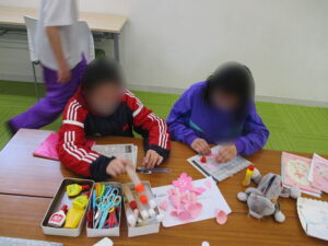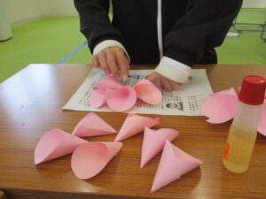 この日は、ピンクの画用紙を使用して桜の花を作りました。ピンクの画用紙に型紙を置いて鉛筆で線を引いてはさみで切り、花びらの準備をしました。花びら、1人5枚準備し、クレープのように丸めて花びらの形を作りました。それが出来たら台紙を下に置いて花びらを5枚、ボンドで固定しました。お花の向きを工夫しながら桜の花を表現していきました。最後に花びらに切り込みを入れて桜の花の形を整えました。さらに小さなサイズの桜にもチャレンジして作りましたよ。