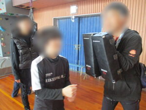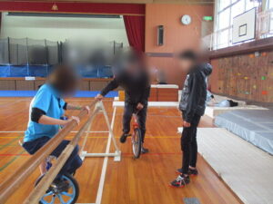 次に指導員が椅子の上から棒を落としてそれをキャッチをするゲームをしました。手のひらを広げて準備して、素早く握ることがコツです。いつ、落ちてくるのだろう?と、緊張感もあるなか、初めにキャッチに成功した者がでるとその場は大変盛り上がりました。練習を繰り返していくと成功者がどんどん増えてきました。