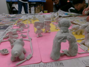 始めのテーマは「食べ物」です。作りやすいい食べ物から自分の好きな食べ物等、頭に浮かんだ物を形にしていきます。「餃子できた~」「見て、フランクフルト!」と自分が作った食べものを見せ合う姿がありました。