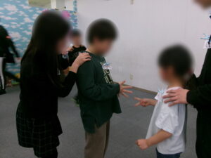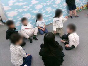 人数集めはピアノの音が鳴った分だけ子ども達で集まる内容です。「集まろ!」「あと3人!」と子ども達同士声を掛け合いながら集まる姿がありました。ピアノの数を指折り数えると…「!!今日の人数や!」最後は子ども全員で集まり、一体感を感じることができました。1年生の子もお友達に囲まれて、嬉しそうな表情でした😊