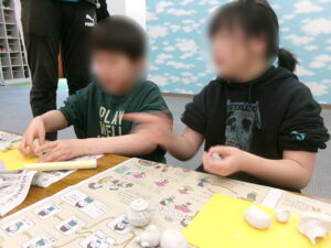 今回はあぶら粘土を使って様々な物を作りました。まず始めに丸、四角、星、ハートといった形を5分間で作っていきます。一見簡単な形作りですが、手の平から指先全体の力のコントロールが大切になってきます。始めは「簡単やん」と得意げな子ども達でしたが、指先の微細運動に星やハートに苦戦する子も多かったです。