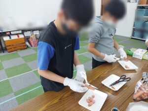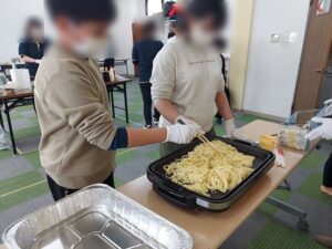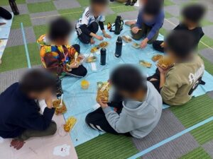 みんなが楽しみにしていたピクニックで、朝から「今日はピクニックやんな!」とウキウキした様子の子どもたち。前日があいにくの雨で地面が濡れていたこともあり、外にピクニックには行けないことを伝えると「えぇ~」と残念そうでしたが、室内にレジャーシートを敷いてみんなで食べよう!と伝えると「やったー」と喜んでいました。焼きそば・ポテト・唐揚げのチームに分かれて調理をスタートしました。焼きそばは麺を炒める係・ウインナーをハサミで切る係に分かれました。「麺ほぐれてきた」「ウインナーの大きさこれぐらい?」と任された作業を頑張って取り組んでいました。炒めている麺を見て「このままでも美味しそう」と早く食べたい気持ちがとても伝わってきましたよ。ポテトチーム・唐揚げチームも揚げたりオーブントースターで焼いたりとそれぞれの作業を最後まで頑張ってくれていました。できあがってくると室内がとてもいい匂いになり、「お腹すいたー」「早く食べたい」と待ちきれない様子でした。外には行けませんでしたが、室内にレジャーシートを敷いてみんなで食べると、ピクニック気分になりとても楽しい雰囲気で食事を楽しみました。おかわりもたくさんして大満足な子どもたちでしたよ。