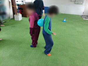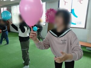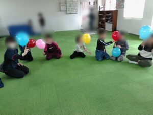 この日は、子どもたちの大好きな風船を使って活動を行いました。学校から帰ってきて準備してある風船を見つけ、「今日の活動楽しみやな♬」と急いで宿題に向かい早々と終わらせる姿も見られましたよ☺準備運動で体をほぐしてから始めました。まずは風船を一人1個ずつ持ち、手のひらや手の甲、膝などでポンポンタッチ🎈指1本で風船を支えるバランス遊びをしました。子どもたちは、お友達とぶつからないようにしながら奮闘していましたよ💦また二人ペアで背中合わせでの風船運びや風船バレーとたくさん風船を使った遊びを楽しみました。大興奮・大盛り上がりで楽しい活動を終えました。